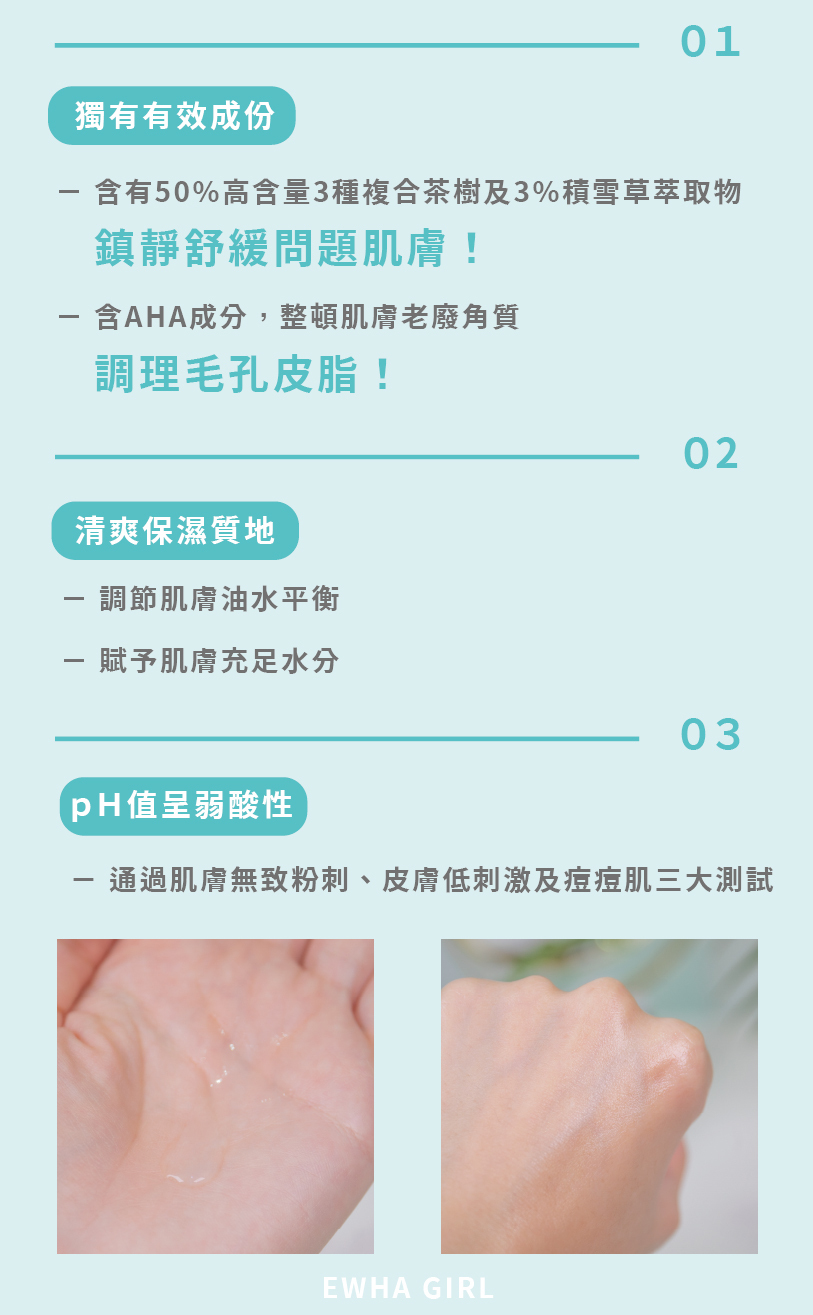 ✅含有50%高含量3種複合茶樹及3%積雪草萃取物,鎮靜舒緩問題肌膚