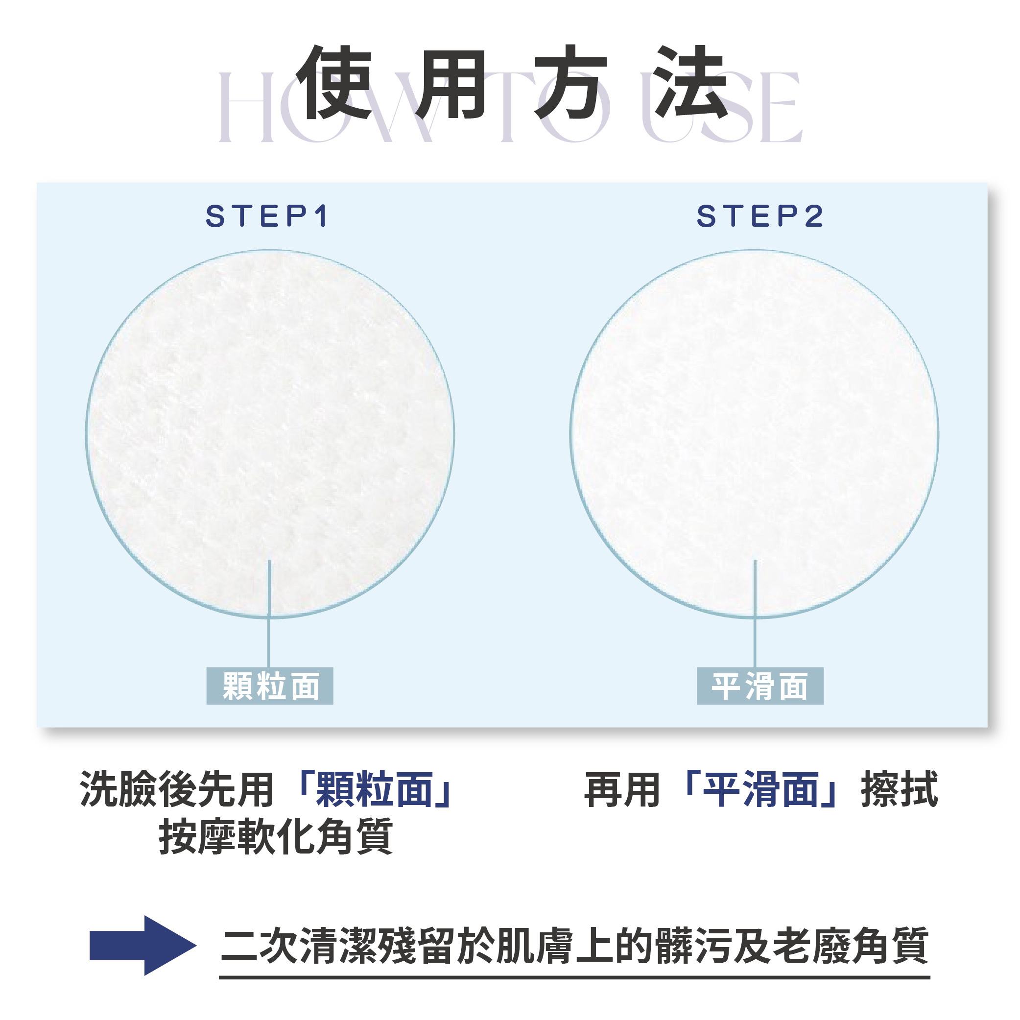 洗臉後,先使用顆粒面按摩軟化角質,再使用平滑面擦拭